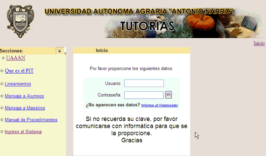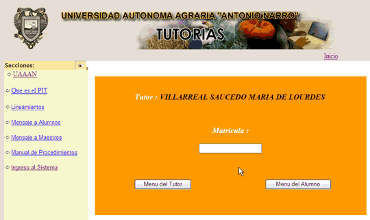 3.- Puedes seleccionar la opción que desees de la página de tutorías para que conozcas la información que corresponda. 4.- Al seleccionar la opción de Ingreso al Sistema se desplegara una página donde una vez que ingreses podrás conocer la información del alumno tutorado y así es la página que encontrarás: Nota: